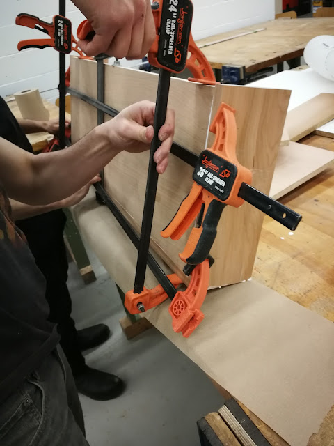 The hardwood of the crown was cut on the table saw. Ramy installed feather boards for safety and accuracy